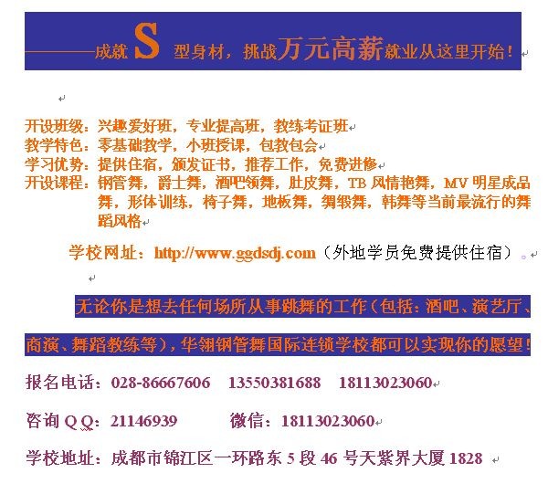 (成都武侯区华翎钢管舞)热线71:028-65270070       手机:13568911011       四川省成都市武侯区浆洗街4号附14号3楼